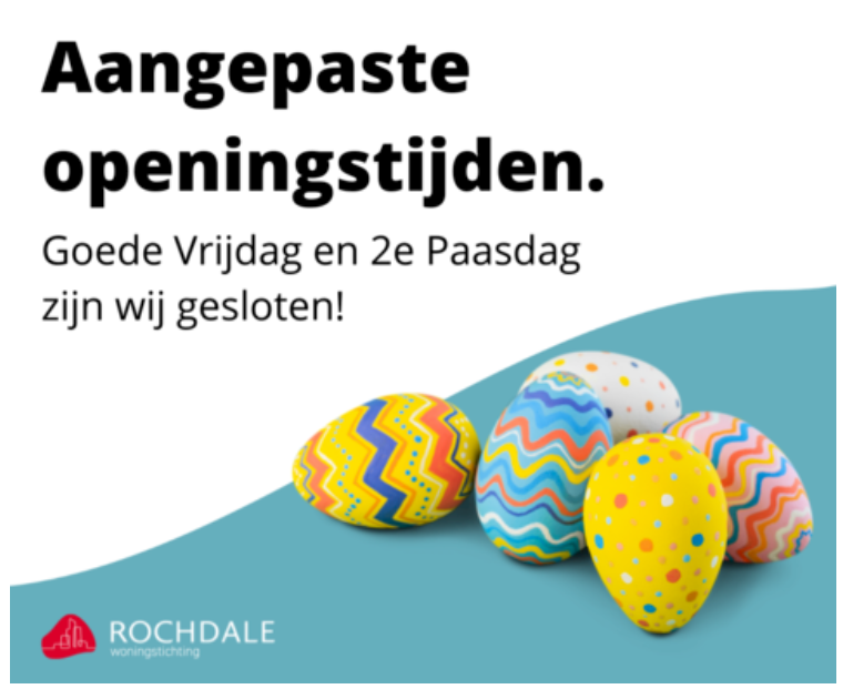 Op Goede Vrijdag (15 april) en 2e Paasdag (maandag 18 april) zijn wij gesloten. Sommige zaken bijvoorbeeld een reparatieverzoek inplannen of uw huur betalen, kunt u ook online regelen.
