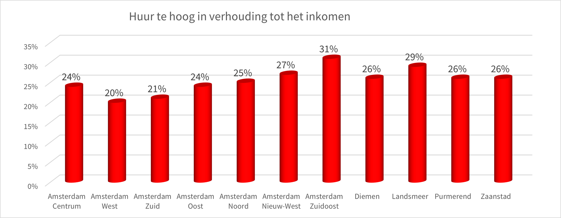Dit probleem speelt het minst in Amsterdam West. Ook al heeft daar nog altijd 1 op de 5 huurders een probleem om de rekening voor energie en de huur te betalen. Het probleem is het grootst in Amsterdam Zuidoost. Daar kan bijna 1 op elke 3 huurders de vaste lasten niet meer betalen.