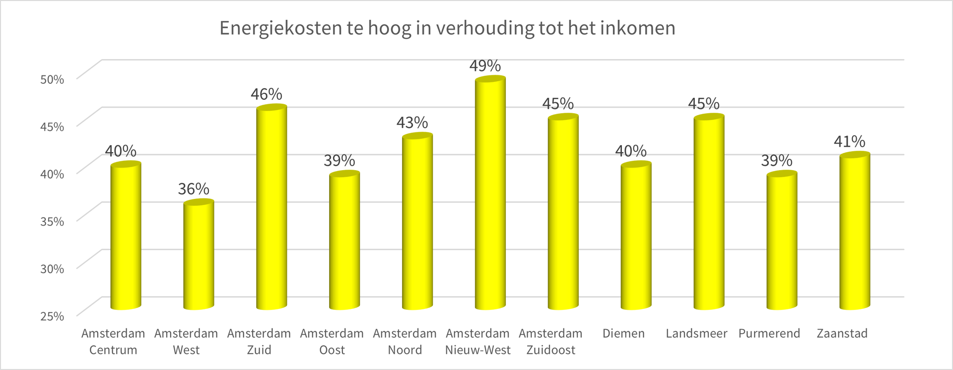 42% van onze huurders geeft aan dat de kosten voor energie te hoog zijn geworden voor hun inkomen. Van elke 100 huurders worden dus 42 huurders hard getroffen door de hoge energierekening. Dit probleem speelt het meest bij onze huurders in Amsterdam Nieuw-West, en daarna bij onze huurders in Amsterdam-Zuid.